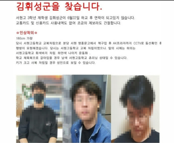 장작 속보서현고 3학년 학생 김휘성 군 변사체로 발견.